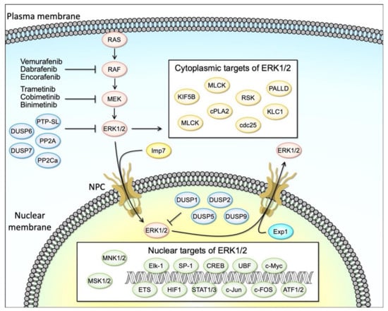 The regulation of RAF/MEK/ERK signaling pathway. The RAF/MEK/ERK signaling pathway regulates diverse cellular processes through the phosphorylation of cytoplasmic and nuclear proteins. Activated ERK1/2 translocates to the nucleus by Imp7 (Importin 7) and inactive ERK1/2 is nuclear exported by Exp1 (Exportin 1). Serine/threonine phosphatases (PP2A and PP2Ca), tyrosine phosphatases (PTP-SL), and dual-specificity phosphatases (DUSP6, 7) directly dephosphorylate ERK1/2 in the cytoplasm. Dual-specificity phosphatases (DUSP1, 2, 5, and 9) dephosphorylate ERK1/2 in the nucleus. Abnormal activation of RAF/MEK/ERK1/2 signaling is known in various cancer cells. BRAF inhibitors (vemurafenib, dabrafenib, and encorafenib), and MEK inhibitors (trametinib, cobimetinib, and binimetinib) prevent ERK1/2 activation and are currently used for cancer therapy.