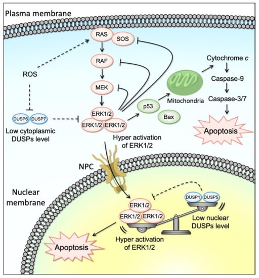Activation of ERK1/2 upstream factors or down-regulation of DUSP6/7 by various stimuli (such as ROS) induces the activation of ERK1/2 in the cytoplasm. Activated cytoplasmic ERK1/2 induces the mitochondrial apoptosis or is translocated to the nucleus through the NPC (nuclear pore complex). Down-regulation of DUSP1/5 by the stimuli (such as ROS) also induces the activation of ERK1/2 in the nucleus. Consequently, either down-regulation of cytoplasmic or nuclear DUSPs leads to the accumulation of activated ERK1/2 in the nucleus. Sustained ERK1/2 activation above a certain threshold activates specific pro-apoptotic targets and induces apoptosis.