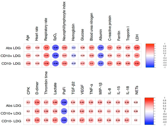 Interestingly, we found a moderate negative correlation between LDG and PaFi (PaO2/FiO2) and positive correlations with features of tissue turnover such as creatine phosphokinase (CPK), lactate dehydrogenase (LDH), Troponin I, and lactate as well as with variables related to immunothrombosis such as D-dimer and pro-thrombin time. Additionally, LDG had a positive correlation with serum TGF-β2, VEGF, TNF-α, MIP-1β, IL-8, IL-15, IL-18 and plasmatic NETs measured as NE-DNA complexes (Figure 1 and supplementary Figure S2).