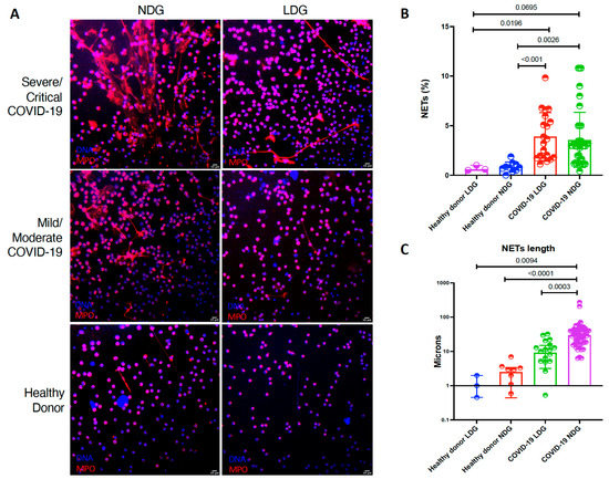 We evaluated the capacity of both NDG and LDG to produce NETs ex vivo. Both LDG and NDG from COVID-19 patients produced a higher percentage of NETs in comparison to healthy donors (Table 2 and Figure 2). Moreover, as shown in Table 2 and Figure 2, NETs from NDG are characterized by a greater length (p < 0.0001).