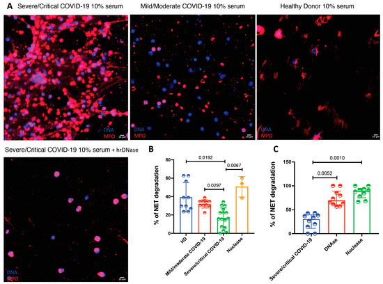 A possible mechanism explaining NET accumulation in tissues from COVID-19 patients is a deficient degradation of these structures. Therefore, we decided to test if patients with this viral infection have a deficient degradation capacity of NETs in serum. As depicted in Figure 4, sera from patients with severe/critical COVID-19 had a lower NET degradation capacity in comparison with sera from mild/moderate COVID-19 patients and healthy donors as well as in comparison with micrococcal nuclease treatment (15.98 (6.42–25.20) vs. 34.29 (26.12–58.11) vs. 32.45 (29.39–34.69) and 53.88 (38.88–60.00), respectively, p = 0.0004). Since we found that sera from patients with severe and critical COVID-19 had deficient NET degradation capacity, we decided to test if this could be reverted by the addition of hrDNase and micrococcal nuclease. As shown in Figure 4, the addition of DNase was able to restore the degradation capacity of COVID-19 sera (p < 0.0001).