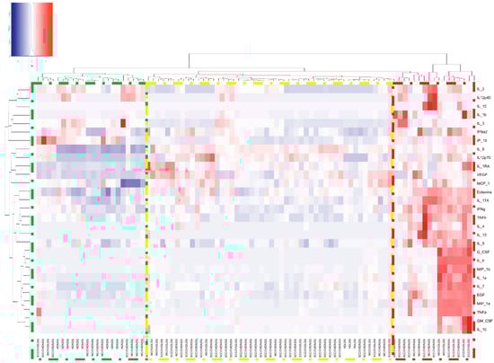 Heat map of the expression of cytokines and chemokines after macrophages were stimulated with COVID-19 and healthy donor NETs. The proinflammatory response is mainly elicited by COVID-19 LDG (red box) and NDG NETs (yellow box), whilst none of the healthy donor NETs promoted the secretion of these cytokines and chemokines (green box). Heatmap based on hierarchical clustering by Ward’s method was constructed.