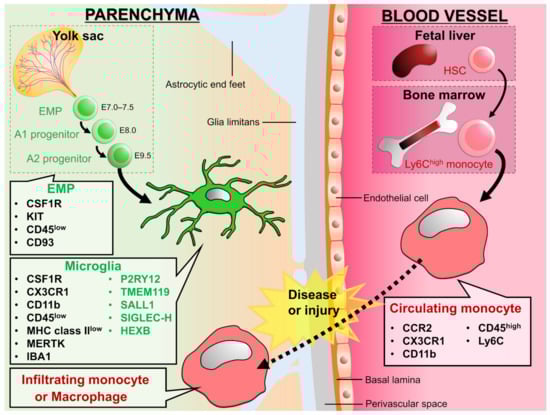 Although circulating monocytes basically differentiate into macrophages and dendritic cells after infiltrating into tissues, the possibility that they exert their phagocytic function even before differentiating into macrophages cannot be excluded. Therefore, in this review, for studies in which differentiation into macrophages cannot be clearly confirmed, monocytes after invasion will be described as blood-derived monocytes but not as macrophages. Although microglia and blood-derived monocytes show similar characteristics in the parenchyma, the methods and criteria used to distinguish between them (degree of expression of molecular markers and morphology) will be introduced and summarized in Table 1 and Table 2. In addition, please refer to Figure 1, which shows each type of macrophages.