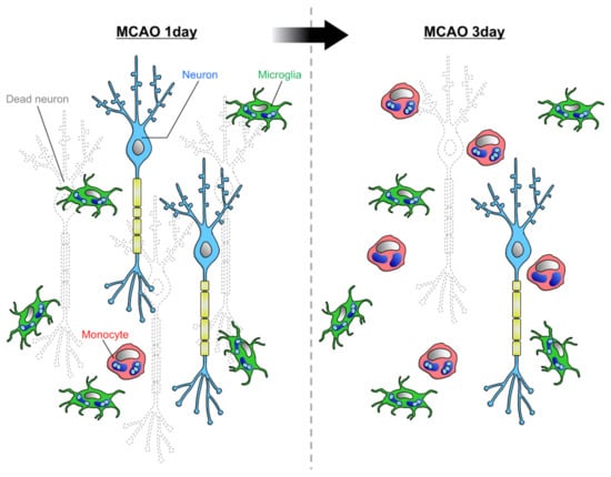 Phagocytic capacities of microglia and infiltrating monocytes in ischemia: Rajan et al. reported that at 1 day after MCAO, when neuronal cell death is active, the majority of phagocytes in the parenchyma are microglia []. As more time passes, the infiltration of monocytes increases, and the ratio of microglia to monocyte becomes about 5:4.