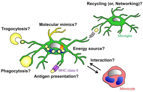 It has been shown that phagocytosis can be used as a tool for intercellular communication, and a representative example is antigen presentation. Dendritic cells are the most common type of cells that present antigens, but a number of papers have argued that microglia and macrophages also have the potential to present antigens []. However, it should be noted that most of the findings from these studies are based solely on the presence or absence of expression of antigen presentation-related proteins such as MHC class II. In a recently published paper, Mundt et al. examined the ability of dendritic cells, B cells, microglia, and macrophages to present antigens using myelin debris []. The authors tested the possibility that each cell type presents antigens by knocking out antigen-presentation-related proteins specifically in these cell types, and they showed that dendritic cells, but not microglia or macrophages, regulate T cell activation via antigen presentation.