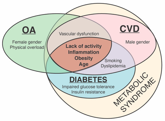 Although the aetiopathogeneses of OA and CVD are different, they share several similar risk factors. Preventable risk factors, including reduced physical activity, obesity, vascular dysfunction and inflammation, are closely related not only to OA and CVD but also diabetes, and the symptoms of these diseases, such as elevated blood pressure and blood glucose and a high level of waist fat, are constituents of metabolic syndrome (Figure 1) [50,51,52].