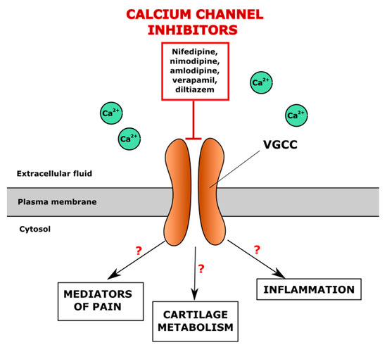 Voltage-gated ion channels represent a family of transmembrane proteins that play important roles in the electrical signalling in cells. The activity of voltage-gated ion channels is regulated by the cell membrane potential and opening channels, which allows the movement of ions along an electrochemical gradient across the cellular membranes. Voltage-gated ion channels are a class of transmembrane proteins that participate in the ion shuttling through the membrane and are activated by changes in the electrical membrane potential near the channel [143]. Voltage-gated calcium channels (VGCC) regulate entry of Ca2+, one of the most important second messengers, to the cell, initiating many different cellular events, including the depolarization and repolarization required for efficient electromechanical coupling in cardiomyocytes, regulation of enzyme activity, synaptic transmission, gene transcription, secretion, etc. [144]. Inhibitors of VGCC are known as one of the biggest groups of anti-hypertensive drugs. The pathogenesis of OA and CVD seems to have a common but neglected link through the altered intracellular Ca2+ (iCa2+) signalling, which may contribute to the development of comorbidities in some individuals. Since the L-type calcium channel Cav1.2 is abundant in chondrocytes [145], the inhibitors of VGCC channels, such as nifedipine, amlodipine, verapamil and diltiazem, commonly used for the treatment of CVD, may affect the articular cartilage by modulating several responses, including pain modulation, altered cartilage metabolism and reduction of inflammation; however, the exact mechanisms are not fully elucidated so far (Figure 2). The VGCC function in chondrocytes and pathogenesis of OA has been previously reviewed [146]. The possible effects of L-type calcium channel inhibitors on cartilage and regulation of OA development are summarised in Table 1.