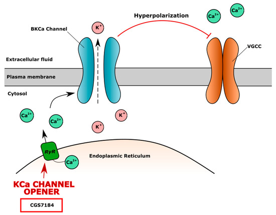 High-conductance calcium-dependent big K+ channels (BKCa) are also widely expressed in chondrocytes. The opening of the BKCa channel causes potassium efflux into extracellular fluid and the hyperpolarization of the membrane. The increased extracellular level of K+ and membrane hyperpolarization blocks VGCC channels, leading to the lower level of iCa2+. The KCa channel agonist CGS7184 releases Ca2+ from the endoplasmic reticulum through ryanodine receptors (RyR), indirectly activates the BKCa channel and causes membrane hyperpolarization and closure of the VGCC channel (Figure 4). The ryanodine receptor isoform RYR2 is the major cellular mediator of calcium-induced calcium release (CICR) in mammalian cells [167].