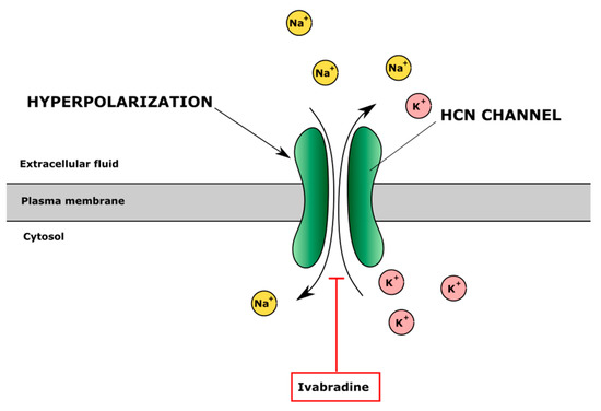 The effect of inhibitor of hyperpolarization-activated cyclic nucleotide-gated (HCN) channels ivabradine on ion regulation. Ivabradine blocks HCN channel inhibiting Na+ influx and K+ efflux and changes intracellular and extracellular ion balance and cell membrane potential.