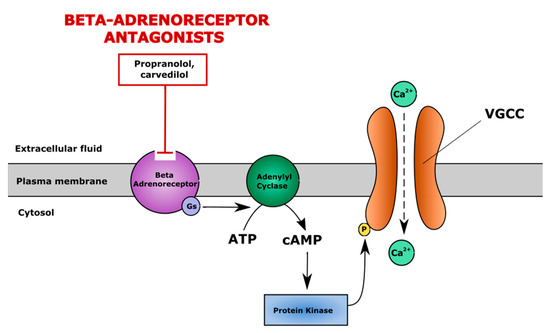 The mechanism of action of β-adrenergic system antagonists. β-adrenergic system antagonists (e.g., propranolol, carvedilol) block β-adrenoreceptors and suppress cAMP/PKA pathway-induced activation of voltage gated calcium channels (VGCC), maintaining a physiological level of iCa2+. cAMP—cyclic adenosine monophosphate, PKA—protein kinase A.