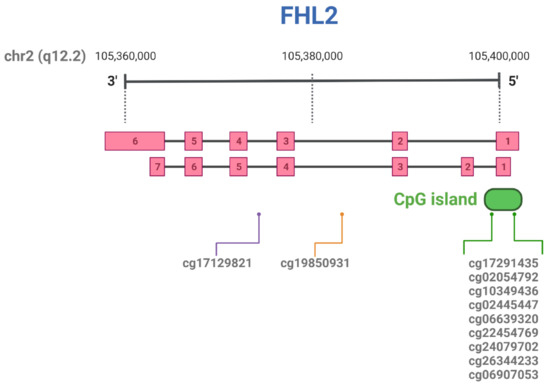 Schematic representation of FHL2 transcript variants (exons are sequentially numbered) and relevant CpG sites, according to Genome Browser (GRCh38/hg38 and GRCh37/hg19). Created with BioRender.com.