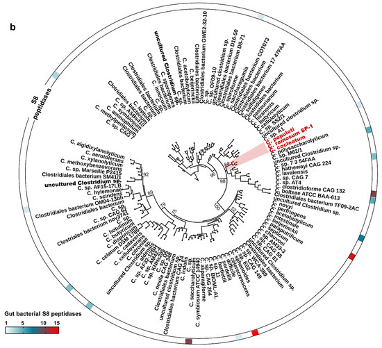 Protein alignments were performed using ClustalW, and the results were visualized using Espript 3.0 [31]. Conserved residues were highlighted according to specific criteria set by the software (http://espript.ibcp.fr/ESPript/ESPript/esp_userguide.php#line_4, accessed on 1 July 2021). Clostridium subtilisin-like protease sequences were retrieved from the public database NCBI. The resulting data were filtered to remove partial and redundant sequences using an internally developed script based on the identity of protease sequences. This reference set was used to look against the human gut metagenomic catalog of ~10 million genes in order to retrieve gut Clostridium sequences at a threshold of 90% sequence identity and track phylogenetic relationships [32]. The tree was saved in Newick format and uploaded to the iTOL web server for visualization [33]. The average number of S8 peptidases per analyzed Clostridium genome was estimated. Only completely annotated genomes were considered.