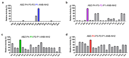 Results of the deconvolution of the ABZ-P4-P3-P2-P1-ANB-NH2 library against SP-1. The x-axis indicates the amino acid fixed at each P position. P1, P2, P3, and P4 correspond to the mixture of 19 amino acid residues. (a) P1 position was fixed with the most active residue (b) P2, (c) P3 and (d) P4 profiling were performed in a similar manner. All measurements were performed in triplicate, and the y-axis indicates the activity (mean ± SEM) relative to the mean value of the highest signal detected for each P position.