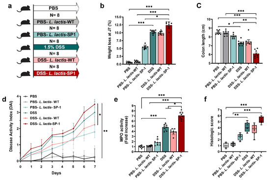 Administration of L. lactis secreting SP-1 influences colitis. (a) C57BL/6 mice were provided with water or 1.5% DSS-containing water for 7 days (N = 8 in each group). Mice were orally administered with PBS, PBS-L. lactis-WT, PBS-L. lactis-SP-1, DSS alone, DSS-L. lactis-WT or DSS-L. lactis- SP-1 (5 × 109 CFU L. lactis-WT or SP-1-expressing L. lactis were evaluated / day). (b) Body weight loss for each group. (c–e) Mice were euthanized (day 8), and (c) colon length, (d) disease activity index, and (e) colonic MPO activity were measured. (f) Histological scores were determined. Data are presented as mean ± SEM from a representative experiment (N = 8 biologically independent animals). Analyzed by Kruskal–Wallis followed by the multi-comparison Dunn’s test. * p < 0.05; ** p < 0.01 and *** p < 0.001.