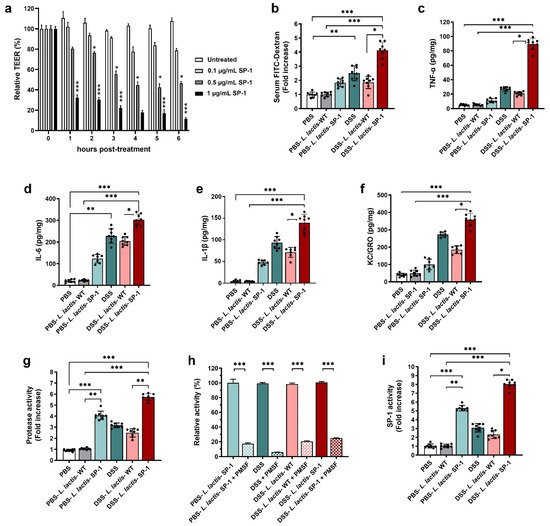 To explore the relevance of SP-1 activity to barrier dysfunction, we added recombinant SP-1 to the apical side of confluent Caco-2 monolayers. Results showed that SP-1 activity enhanced permeability, as evidenced by a dose-dependent decrease in transepithelial electrical resistance TEER (Figure 5a), in comparison to untreated cells (p < 0.05; p < 0.001). Based on these results, we examined potential pro-inflammatory effects of SP-1 secretion on the epithelial barrier in DSS-treated mice. To this end, we quantified the permeability by orally administering FITC-dextran to mice and estimating the serum levels. As expected, the diffusion of FITC-dextran through the epithelium was significantly increased in DSS-L. lactis-SP-1-treated mice as compared with DSS-L. lactis-WT, PBS-L. lactis-SP-1, and PBS-L. lactis-WT groups (p < 0.05; p < 0.01; p < 0.001, respectively) (Figure 5b). We next examined cytokine production and found that levels of pro-inflammatory TNF-α, IL-6, IL-1β, and neutrophil chemoattractant KC/GRO were significantly increased by 4.2-, 1.4-, 2-, and 1.9-fold, respectively, in DSS-L. lactis-SP-1 mice compared with the DSS-L. lactis-WT (p < 0.001; p < 0.05; p < 0.01; p < 0.05, respectively) (Figure 5c–f). Supporting the hypothesis that uncontrolled protease activities could contribute to colitis, we, therefore, assessed proteolytic activity in fecal samples, which showed 4-fold higher proteolytic activity in PBS-L. lactis-SP-1 than PBS-L. lactis-WT (p < 0.001) (Figure 5g). DSS-L. lactis-SP-1 mice showed significantly increased protease activity in comparison to DSS-L. lactis-WT (2.5-fold higher, p < 0.01) and PBS-L. lactis-WT mice (5.7-fold higher, p < 0.001) (Figure 5g). In the DSS-L. lactis-WT and DSS-L. lactis-SP-1 groups, the protease activity was significantly reduced by nearly 79.4% and 75% in the presence of PMSF (p < 0.001) (Figure 5h). Seeing that PMSF is a broad-spectrum serine protease inhibitor, we could conclude that serine protease activity increased the most in this context. We also studied the profile of protease subfamilies associated with gut inflammation, including trypsin, neutrophil elastase, and proteinase 3. Our data showed that these activities were slightly increased in DSS-L. lactis-SP-1 fecal samples compared with DSS and DSS-L. lactis-WT (Figure A1). No statistically significant differences were detected between these groups. Using SP-1 designed substrate, we demonstrated that fecal SP-1 activity was significantly upregulated, a change reflected by 5- and 8-fold increases in PBS-L. lactis-SP-1 and DSS-L. lactis-SP-1 compared with PBS-L. lactis-WT (DSS-L. lactis-SP-1 = 11.7 ± 0.4 U/mg, PBS-L. lactis-SP-1 = 7.7 ± 0.3 U/mg, PBS-L. lactis-WT = 1.47 ± 0.21 U/mg) (Figure 5i).