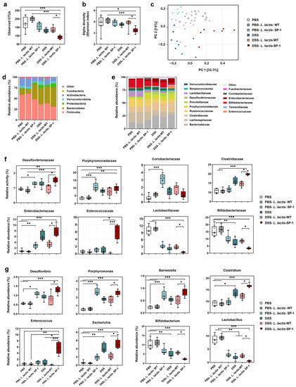 It is well known that epithelial barrier dysfunction and a dysregulated gut microbiota are highly associated with gut inflammation [47,48]. Thus, we examined whether administered L. lactis secreting SP-1 altered the composition of gut microbiota in the presence or absence of DSS. 16S rRNA pyrosequencing analysis of fecal samples showed that DSS-L. lactis-SP-1 supplementation significantly reduced bacterial richness compared with DSS-L. lactis-WT, PBS-L. lactis-WT and PBS groups (p < 0.001, p < 0.05, respectively) (Figure 6a). The Shannon index revealed significant differences in bacterial α-diversity between the DSS-L. lactis-SP-1 and DSS-L. lactis-WT group (p < 0.05) (Figure 6b). Principal coordinate analysis (PCoA) revealed a distinctly different clustering of the gut microbiota between DSS-L. lactis-SP-1 and the other groups (Figure 6c). Subsequent analysis at the phylum level revealed that Firmicutes, Bacteroidetes, and Actinobacteria did account for more than 90% of total bacteria in PBS mice (Figure 6d). Of note, PBS-L. lactis-SP-1 mice showed increased proportions of Bacteroidetes and Proteobacteria, whereas Verrucomicrobiota remained at a low level (Figure 6d). DSS treatment altered the bacterial structure, thus contributing to increased populations of Proteobacteria and Bacteroidetes and reduced Actinobacteria and Firmicutes versus PBS mice (Figure 6d). Interestingly, the administration of DSS-L. lactis-SP-1 upheld such phylum-level shift by expanding the abundance of Proteobacteria and Bacteroidetes while limiting the abundance of Actinobacteria and Firmicutes (Figure 6d). At the family level, we found that PBS-L. lactis-SP-1 mice exhibited significantly higher Desulfovibrionaceae, Porphyromonadaceae, and Coriobacteriaceae than PBS-L. lactis-WT and PBS (Figure 6e–f). In the DSS-L. lactis-SP-1 group, increased abundances of Enterococcaceae, Enterobacteriaceae, Desulfovibrionaceae, and Clostridiaceae were observed in comparison to DSS-L. lactis-WT (Figure 6e–f). On the other hand, levels of Lactobacillaceae and Bifidobacteriaceae were significantly reduced (Figure 6f).