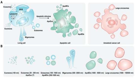 Multiple subtypes of eukaryotic EVs exist and they are primarily categorized based on their biogenesis, subcellular origin, and size (Figure 1) [,]. Exosomes are vesicles that are endocytic in origin and shed as a consequence of multivesicular bodies (MVB) or late endosomes fusing with the plasma membrane []. They range in size from 30 to 150 nm and were believed to be the smallest EV subtype until the recently [,]. Exomeres have been identified as secretory nanoparticles that are less than 50 nm in size with their mode of biogenesis currently unknown [,], whereas shedding microvesicles (MVs) are larger in size and may range from 100 to 1000 nm. They originate due to budding or outward vesiculation of plasma membrane, thus also referred to as ectosomes [,]. Furthermore, there are new classes of EVs defined, such as migrasomes and large oncosomes [,,]. Up until now, apoptotic cells were thought to only shed apoptotic bodies (ApoBDs) which are similar to microvesicles in origin as they emerge due to budding of plasma membrane. However, ApoBDs are larger in size and may range from 50 to 5000 nm [,]. More recently, apoptotic cells were found to partake in secretion of other EV subtypes and apoptotic cell-derived EVs (ApoEVs) now include apoptotic microvesicles (ApoMVs) and apoptotic exosomes (ApoExos) which are physiologically distinct from ApoBDs []. Similar to MVs, ApoMVs range in size from 200 to 1000 nm and also called apoptotic microparticles. They have a higher membrane integrity than ApoBDs, promoting better molecular exchange [,,], whereas ApoExos are the most recent addition to ApoEVs and were initially reported to be released by endothelial cells following caspase 3-dependent MVB formation [,]. Though there is limited knowledge regarding their origin and function, they continue to be explored in-depth as final messengers of apoptotic cells [].