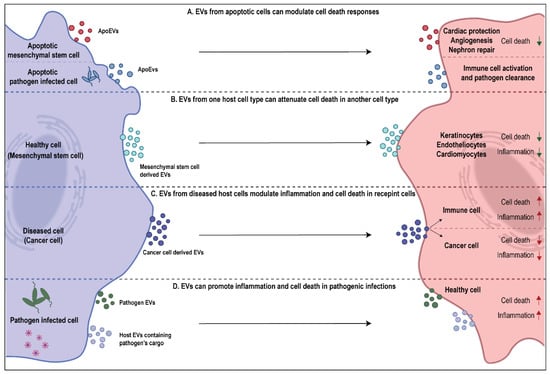Context dependent roles of EVs in mediating cell death and inflammation. (A) ApoEVs have the ability to either attenuate or promote cell death. MSC derived ApoEVs have regenerative function whereas ApoEVs from pathogen infected cells induce activation of immune cells, leading to enhanced targeting and clearance of pathogen cells. (B) Similarly, EVs from healthy MSCs have regenerative function in preventing cell death and inflammation in various cell types. (C) Contrastingly, EVs from diseased host cells may function in different ways depending on the recipient cell. For instance, cancer cell derived EVs promote cell death and inflammation in immune cells but prevent cell death and inflammation in other cancer cells. (D) Infected cells can shed pathogen derived EVs or host EVs loaded with pathogen’s cargo. These EVs can promote cell death and inflammation in recipient host cells.