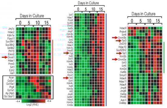 PCR array with micromass cultures established from C3H10T1/2 BMP-2 cells collected on designated days of in vitro cartilage formation. Chondrogenic differentiation-associated changes in the expression of epigenetic factors were visualized with a heatmap. The red squares refer to upregulated genes, and the green squares indicate downregulated genes. Genes next to the red line are mostly upregulated between the 5th and 10th days of culturing. Genes neighboring the blue line are upregulated around culturing day 15. Genes next to the green line are upregulated between the 10th and 15th days of culturing. Specific DNA methylation and demethylation regulator genes are marked with red arrows. Data indicated with the black rectangle: expressional changes of chondrogenic and osteogenic marker genes in order to verify the cartilaginous differentiation of micromass cultures.