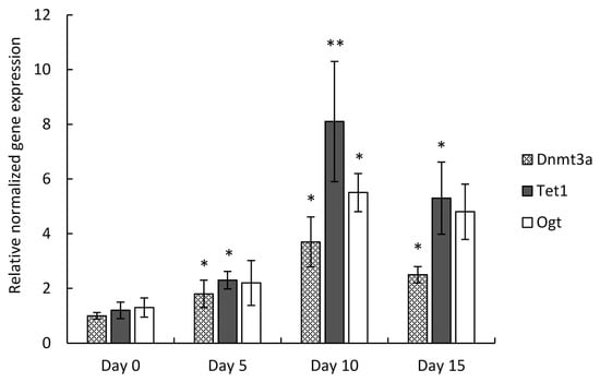 RT-qPCR analysis of Dnmt3a, Tet1, and Ogt gene expression in micromass cultures established from C3H10T1/2 BMP-2 cells, collected on culturing days 0, 5, 10, and 15. Measured CT values were normalized to that of Actb and to culturing day 0. Mean ± SEM and levels of significance between consecutive culturing days (* p ˂ 0.05, ** p ˂ 0.01) are indicated. One-Way ANOVA with Tukey HSD was employed for evaluating significance. Representative results out of 3 independent experiments (biological replicates) showing similar trends of changes.