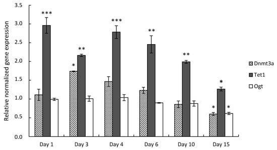Next, we performed expression analysis of the genes of interest in primary chondrifying micromass cultures. Chondrogenic cell cultures were established from mouse embryonic limb buds and collected on designated culturing days. Transcripts for the DNA methylation genes were also identified in this in vitro model by RT-qPCR; however, their expression profile was more varied compared to the cell line-based model. After choosing the most stably expressed normalizing gene, the mean quantity values for the three examined DNA methylation-associated genes were normalized to the reference gene Sdha, and the normalized mean quantity was set to 1.0 on culturing day 0 for each of the genes. Tet1 showed the highest expressional fold change among the three examined genes, with peaks on days 1 (2.96-fold, ±0.21) and 4 (2.78-fold, ±0.17) of culturing. The Dnmt3a transcript level was the highest on day 3 (1.74-fold, ±0.01) and displayed a significant downregulation by day 15 (0.6-fold, ±0.04). Ogt, on the contrary, was constantly expressed by the differentiating chondrocytes, except on day 15, when it was significantly downregulated (0.61-fold, ±0.03) (Figure 3).