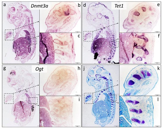Furthermore, we aimed to prove the in vivo relevance of the three examined genes in chondrogenesis. Therefore, we performed in situ hybridization analyses of Dnmt3a, Tet1, and Ogt in 15-day-old whole mouse embryo samples. This experiment revealed that all three genes were expressed in the territories of hyaline cartilage islands of the developing forelimb, vertebrae, and sternum of the E15 mouse embryos. Among the three examined genes, densitometry analysis revealed that Dnmt3a showed a moderate expression pattern (Figure 4a–c), Tet1 signals were the strongest (Figure 4d–f), while Ogt appeared to have a weak expression in the primitive limb and vertebrae compared to the other two epigenetic markers (Figure 4g–i; see also Figure S1 and Table S4 in the Supplementary Materials). At this developmental stage, cartilage had not started to differentiate into bone, the hypertrophic cartilaginous area was minimal, and ossification had not commenced yet, but the cartilaginous primordia of the future bones was well visible. The purple metachromatic color was obtained with the application of DMMB, in order to demonstrate the cartilage elements of the developing limbs, vertebrae, skull, and ribs (Figure 4j–l).