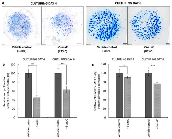 Effect of the DNA methylation inhibitor 5-azaC on cartilage ECM production, cell proliferation, and cell viability. (a) Metachromatic staining of 4- and 6-day-old primary chondrifying micromass cultures. 5-azaC (or DMSO as the vehicle control) was applied from the first or the third day of culturing, respectively, for 72 h at a final concentration of 10 µM. Metachromatic ECM accumulation was visualized by dimethyl-methylene blue (DMMB) qualitative staining assay, and the proportion of the metachromatic area was analyzed by MATLAB application (percentages are indicated under the photomicrographs). Original magnification was 4×. Scale bar: 1000 or 500 μm. Effects of 5-azaC on (b) cell proliferation and (c) cell viability (mitochondrial activity) in primary chondrifying micromass cultures. Cell viability was determined by using the MTT assay, and cell proliferation was examined by the 3H-thymidine incorporation assay on day 4 or day 6, following treatment with 5-azaC or DMSO (vehicle control). Statistically significant differences between the proliferation rate and mitochondrial activity of cells in cultures that received the inhibitor versus vehicle control cultures are marked by asterisks (* p < 0.05, ** p < 0.01, *** p < 0.001). Representative data out of 3 independent experiments.