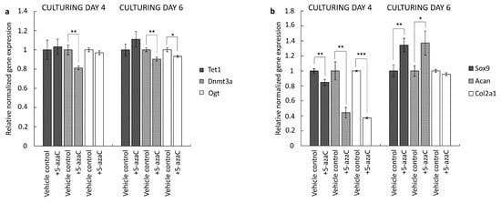 DNA methylation-associated (a) and cartilage-specific (b) gene expression in 4- and 6-day-old primary chondrifying micromass cultures after 5-azaC treatment (vehicle controls were treated with DMSO). The DNA methylation inhibitor was added to the culture medium from the first or the third day of culturing, respectively, for 72 h, at a final concentration of 10 µM. Data are expressed as the mean ± SD relative to the vehicle control and normalized against the reference gene Sdha. Statistically significant differences of the gene expression levels are indicated by asterisks as follows: * p < 0.05; ** p < 0.01; *** p < 0.001. Representative data out of 3 independent experiments.