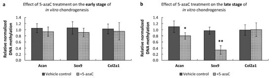 To investigate whether 5-azaC treatment had a direct effect on the observed gene expression changes of the Col2a1 and Sox9 genes, we conducted quantitative methylation-specific PCR on isolated genomic DNA samples. We found that the DNA methylation profiles of the investigated promoters (i.e., Acan, Sox9, and Col2a1) were not affected in the early chondrogenic phase (Figure 7a). However, 5-azaC-mediated inhibition during the late phase of chondrogenesis significantly decreased DNA methylation in Acan (0.8-fold, ±0.107) and Sox9 (0.34-fold, ±0.141) promoters, which could explain the observed altered gene expression of these two genes (Figure 7b).