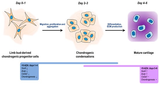 Diagrammatical representation of the key stages of chondrogenic differentiation of embryonic limb bud-derived micromass cultures, showing the regulation of chondrogenic genes triggered by the methylation inhibition 5-azaC on different culturing days.