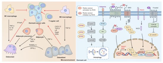 Apart from intrinsic factors, the redox level in the microenvironment of the dormant cancer niche is also essential for the maintenance of cancer dormancy []. The microenvironment in dormant cancer niches is considered a complex system, where different immune cells and cytokines orchestrate the balance of the inflammatory or anti-inflammatory response []. For instance, osteoblasts may secrete CXC chemokine ligand 12 (CXCL12) [,], TGF-β [], growth arrest-specific protein 6 (GAS6) [], osteoprotegerin (OPG) [], osteopontin (OPN) [], and leukemia inhibitory factor (LIF) [], to promote colonization and dormancy of disseminating cancer cells in bone marrow. Osteoclasts may play a dual role by secreting TGF-β to promote dormancy [], while reverse dormancy occurs through parathyroid hormone-related protein (PTHrP) []. In addition, adipocyte precursors produce receptor activators of NF-κB ligand (RANKL) to stimulate osteoclast differentiation, thus awakening dormant cancer cells []. Similarly, adipocytes may promote osteoclastogenesis by secreting tumor necrosis factor α (TNF-α) [] and may induce proliferation with leptin [], which impairs the dormant state of quiescent cancer cells. Moreover, different subtypes of macrophages play different roles in modulating cancer dormancy through different secreted cytokines []. Furthermore, recent advances indicate that elevated CD73 in CD150high CD4+ T cells and CD150high T regulatory cells may protect dormant HSCs in the bone marrow niche from oxidative stress and immune elimination [,]. Managing redox level in the dormant microenvironment may become a potential strategy to control cancer dormancy. However, the crosstalk among these immune cells and inflammatory-dependent factors requires further study.