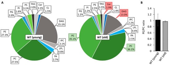 Mitochondrial PL composition changes during aging. (A): PL composition of isolated mitochondria of 7-day-old (young) and 21-day-old (old) wild-type (WT) cultures grown under glycolytic conditions. Data represent relative proportion of total lipids. Significantly (p < 0.05) increased or reduced PLs are marked with green and red boxes, respectively. Exact values (mean ± SD) can be found in supplementary material (Table S1). CL: cardiolipin, Cer: ceramide; DAG: diacylglycerol; IPC: inositol phosphorylceramide; LPL: lyso-phospholipids; PA: phosphatidic acid; PC: phosphatidylcholine; PE: phosphatidylethanolamine; PG: phosphatidylglycerol; PI: phosphatidylinositol; PS: phosphatidylserine; TAG: triacylglycerol. (B): PE/PC ratio of 7 and 21-day-old wild type. Data represent mean ± SD (young: n = 11; old: n = 5).