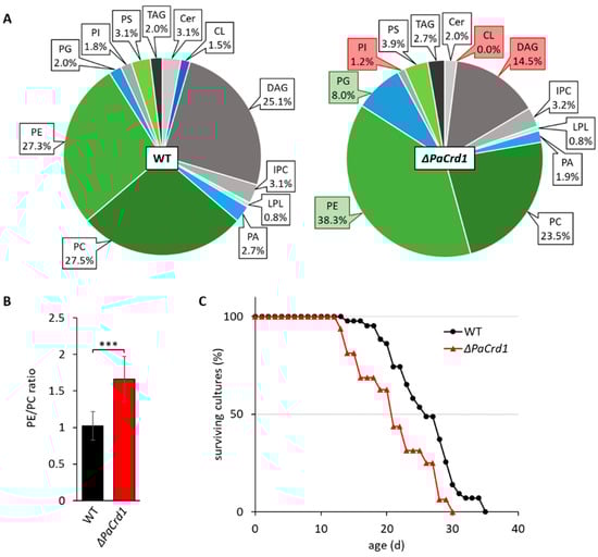 Deletion of PaCrd1 dramatically affects PL metabolism and lifespan. (A): PL composition of isolated mitochondria of 7-day-old wild-type (WT) and ΔPaCrd1 strains grown under glycolytic conditions. Data represent relative proportion of total lipids. Significantly (p < 0.05) increased or reduced PLs are marked with green and red boxes, respectively. Exact values can be found in supplementary material (Table S1). For abbreviations, see caption of Figure 1. (B): PE/PC ratio of wild type and ΔPaCrd1. Data represent mean ± SD (n = 5). *** p < 0.001. (C): Lifespan analysis of wild type (n = 43) and ΔPaCrd1 (n = 16) grown on M2 medium at 27 °C.