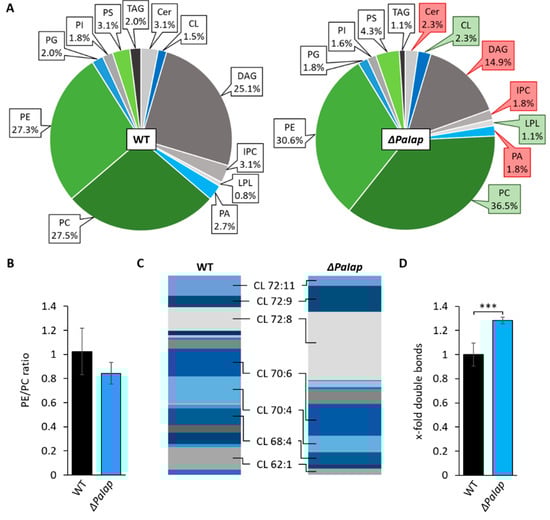 Deletion of PaIap alters mitochondrial lipid profile. (A): Comparative PL composition of isolated mitochondria of 7-day-old wild-type (WT) strains and ΔPaIap mutants grown under glycolytic conditions. Data represent relative proportion of total lipids. Significantly (p < 0.05) increased or reduced PLs are marked with green and red boxes, respectively. Exact values can be found in supplementary material (Table S1). For abbreviations, see caption of Figure 1. (B): PE/PC ratio of WT and ΔPaIap. Data represent mean ± SD (n = 5). (C): Graphical illustration of relative proportions of different CL species in wild type (WT) and ΔPaIap according to total length of all 4 acyl chains (58–72) and total degree of unsaturation (1–11), e.g., CL 72:8. The displayed species represent a selection of the most abundant CL variants in both strains (proportion > 8%). (D): Comparative analysis of total double bonds across all CL species. Total amount of double bonds in CL species was related to wild type (set to 1). Data represent mean ± SD (n = 5). *** p < 0.001. Exact values can be found in supplementary material (Table S2).