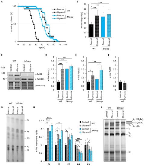 To assess whether this transcriptional activation eventually results in altered mitochondrial PL composition, we performed thin layer chromatography (TLC) analysis of isolated mitochondria of each strain under both, glycolytic and respiratory conditions. We observed an overall increase of the membrane lipids CL, PE and PC in the wild type grown on glycerol (Figure 6G,H), supporting our assumption of transcriptional induction of genes involved in PL synthesis by respiratory growth. This conclusion is in agreement with results from studies in S. cerevisiae, which likewise demonstrated elevated levels of these PLs, in strains growing on non-fermentable ethanol, glycerol or lactate [14,80,81]. As expected, PL levels in ΔPaIap were only slightly affected, as they were already elevated under glycolytic conditions. Overall, our data support the hypothesis, that the increased lifespan of ΔPaIap is strongly related to the enforced enhancement of PL metabolism.