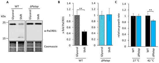 PaIAP is required for short-term adaption to changing environments (A): Western blot analysis of isolated mitochondria of 7-day-old wild type (WT) and ΔPaIap grown on glycerol and subsequently shifted to glucose as primary carbon source (Shift). Coomassie staining was used as loading control. (B): Quantification of PaCRD1 in (A). PaCRD1 levels were determined and related to glycerol control (set to 1). Data represent mean ± SD (n = 3). ** p < 0.01. (C): Heat stress analysis of 9-day-old WT and ΔPaIap strains, grown in CM liquid medium were exposed to 27 as well as 42 °C for 5 h and subsequently placed on M2 solid medium for 3-day regeneration at 27 °C. Growth rates of both strains were determined and related to each strain’s control (set to 1). Data represent mean ± SD (n = 4, except WT (42 °C) n = 8). ** p < 0.01.