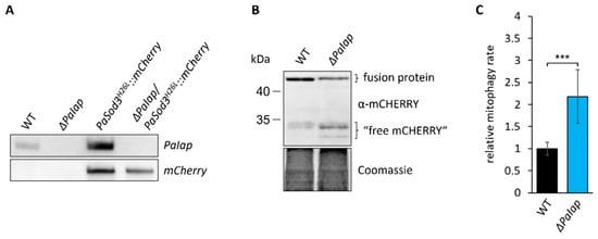 Loss of PaIAP enhances mitochondrial turnover. (A): Southern blot analysis of HindIII-digested DNA of the generated mitophagy reporter strain ΔPaIap/PaSod3H26L::mCherry. (B): Western blot analysis of isolated protein extracts of 6-day-old PaSod3H26L::mCherry (here WT) and ΔPaIap/PaSod3H26L::mCherry (here ΔPaIap) grown in liquid CM medium. Coomassie staining was used as loading control. (C): Quantification of mitophagy rate in (B). Mitophagy rate was determined by ratio of “free mCHERRY” to total “free mCHERRY” + PaSOD3H26L::mCHERRY (fusion protein). Data represent mean ± SD (PaSod3H26L::mCherry n = 9; ΔPaIap/PaSod3H26L::mCherry n = 10). *** p < 0.001.