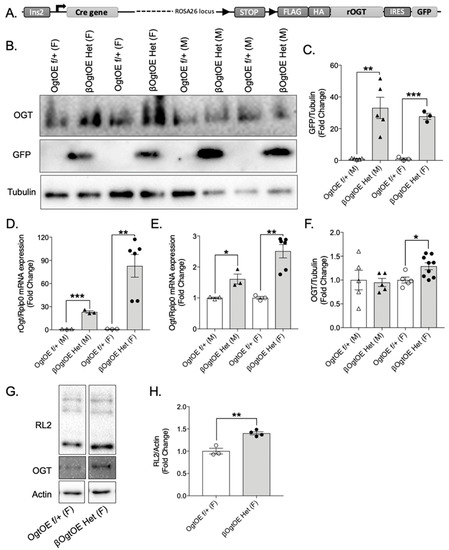 Validation of Ogt overexpression in Pancreatic Islets. (A) Diagram showing the genetic scheme of mice carrying Ins2 driven Cre recombinase and ROSA26-STOPflox-rOgt/GFP in ROSA26 locus. (B) Representative Western blots of Ogt, GFP, and tubulin from pancreatic islets from 4–10-week-old OgtOE f/+ control and βOgtOE Het mice with quantification; fold-change by each sex (n = 5 males, 3–9 females) (C,F). mRNA analysis of transgenic rOgt (D) and Ogt (E) from OgtOE f/+ and βOgtOE Het islets; fold-change by each sex (n = 3 males, 3–6 females). (G) Islets from female control and transgenic animals were incubated in low glucose (2.5 mM) for 6 h and immunoblotted against RL2, pan-O-GlcNAc antibody (H) and actin (n = 3–4). Fold-change to control. Statistical analyses were conducted by using unpaired two-tailed Student’s t-test, with significance * p < 0.05, ** < 0.01, *** < 0.001.