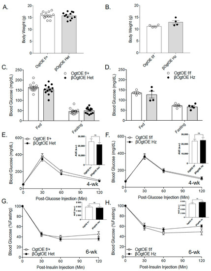 - Keembiyehetty, C.; Love, D.C.; Harwood, K.R.; Gavrilova, O.; Comly, M.E.; Hanover, J.A. Conditional Knock-out Reveals a Requirement for O-Linked N-Acetylglucosaminase (O-GlcNAcase) in Metabolic Homeostasis. J. Biol. Chem. 2015, 290, 7097–7113. [Google Scholar] [CrossRef] [Green Version]