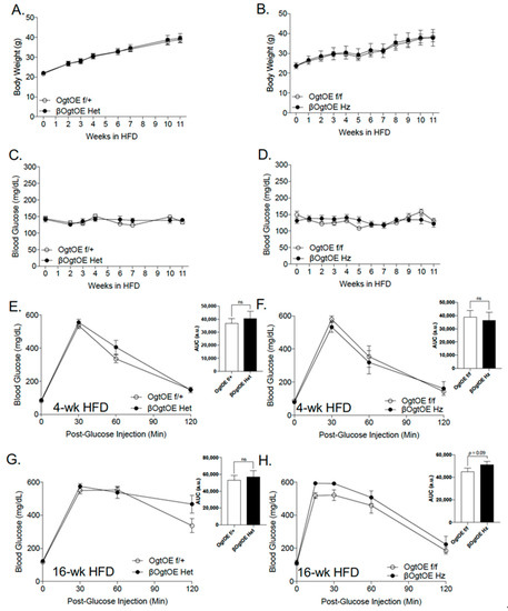 Ogt has been shown to play a critical role in mounting the appropriate β-cell adaptation to a hyper-nutrient environment [11]. To understand the physiologic response to metabolic stress with β-cell Ogt overexpression, the mice were fed a high-fat diet (HFD, 60% Kcal), starting at the age of 8–14 weeks. As expected, all animals gained body weight whilst maintaining euglycemia over 11 weeks of HFD, and no difference between transgenic mice (Het or Hz) and controls was observed (Figure 3A–D). Female transgenic mice (Het and Hz cohorts) appeared to have similar glucose homeostasis compared to the control mice at 4 weeks post-HFD (Figure 3E,F). At 16 weeks post-HFD, βOgtOE Het animals showed normal glucose tolerance, but they showed a higher glucose level at 2-h timepoint post-bolus glucose i.p. injection (Figure 3G). However, βOgtOE Hz mice developed a mild glucose intolerance, and AUC p-value = 0.09 (Figure 3H).