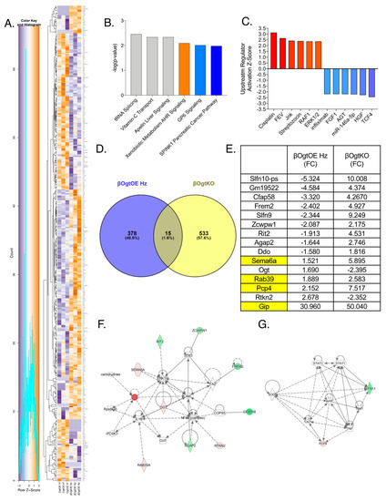 Transcriptomic analysis reveals differentially expressed genes in β-cell OGT overexpressing islets. In-depth RNA sequencing of control and βOgtOE Hz female islets (50 days old; n = 3 identified 393 differentially expressed genes (DEGs) (1.5–fold minimum change; p < 0.05). Heatmap (A), top 6 altered canonical pathways (B), and activated and inhibited upstream regulators in line with IPA-predicted activation status (C). Venn diagram of DEGs from βOgtOE Hz vs. βOgtKO female islets for overlapping genes of interest (D) with fold-change (FC) in each group presented (E). In (E), yellow highlight shows the genes that are altered in the same direction in both βOgtOE Hz and βOgtKO RNAseq analysis. Network analysis of the overlapping genes of interest from βOgtOE Hz dataset, involving 10 (F) or 2 (G) sets of genes; red = upregulated; green = downregulated.