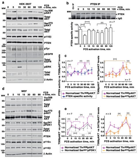 Activation of cells with FCS triggers complementary fluctuations in pAKT levels and PTEN activity. (a–c) HEK-293T cells were incubated in serum-free medium (2 h) then activated with FCS (15%) over different lengths of time (indicated). (a) Cells were lysed and normalized extracts examined by WB with different Ab (indicated). (b) Cell extracts as in (a) (1 mg) were incubated with PTEN Ab for immunoprecipitation (IP). Purified PTEN was examined in a phosphatase assay that measures the PTEN phosphatase product PIP2. The blot confirmed efficient PTEN IP. The graphs show PTEN activity as the PIP2 produced by PTEN at each time point (in arbitrary units), normalized for PTEN content. To compare phosphatase activity at different times, the PIP2 levels at each time were normalized to the mean PIP2 level (equivalent to 1). For controls (Ctr IP), extracts were incubated with protein A. (c) The pAKT signal from assays as in (a) was measured, corrected for the AKT and β−actin content, and normalized to the mean pAKT signal for each assay (equivalent to 1). The graphs represent the relative PTEN activity and pAKT levels (Thr308 or Ser473) at each time point (mean ± SD, n = 7). (d) MEF were grown to confluence, maintained confluent for 24 h, and then incubated in FCS-deprived medium (2 h) before treatment with FCS (15%) for different times. Extracts were examined as in (a). (e) The graph shows the Ser473pAKT, Thr308pAKT and Ser241pPDK1 signals normalized to AKT and PDK1 and to β−actin (mean ± SD, n = 7). Dashed lines indicate time points left out from the original gels (originals blots are included as Supplementary Information). * p < 0.05, ** p < 0.01, *** p < 0.001, Student’s paired t test.