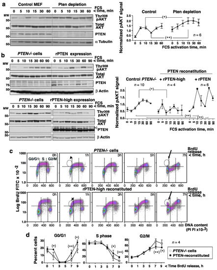 pAKT fluctuations require PTEN expression and affect cell cycle progression. (a) MEF transfected with a control or a Pten siRNA (72 h) were grown to confluence, incubated without FCS (2 h), then treated with FCS (15%) for different times. Blots show the PTEN and Thr308pAKT levels at different time points. The graphs represent the relative pAKT signal (corrected for AKT and α−tubulin) normalized to the mean pAKT signal for control MEF (considered as 1) (mean ± SD, n = 6). (b) PC3 cells were transfected with control, PTEN-Luc, or pRK5-PTEN (high expression, indicated) cDNAs (48 h) and then activated with FCS as in (a). Blots and graph plotting were as in (a). The upper band in the PTEN blot (indicated (<)) comes from the previous Akt blot. (c,d) Control or pRK5-PTEN-reconstituted PC3 cells (as in b) were labeled with BrdU (20 μM, 1 h), then deprived of BrdU, and incubated for different times. (c) DNA content of the BrdU+ cells as determined by flow cytometry. Arrowheads point at BrdU+ cells in the G1-S phase; arrows point to the BrdU+ cells arriving at G0/G1 after G2/M (c). (d) The graphs show the proportion of cells in each phase at different times (mean ± SD, n = 4). * p < 0.05, ** p < 0.01 Student’s unpaired t test.