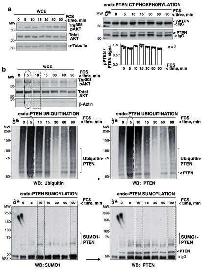 One of the best-established PTEN regulatory mechanisms is the phosphorylation of its C-terminal cluster of four Ser and Thr residues, which keeps PTEN inactive and stable [10,13]. In the present work, phospho-PTEN levels remained constant after the addition of FCS (0–90 min), ruling out CT-phosphorylation as the mechanism behind PTEN inactivation after the addition of GF. The present work does not, however, exclude a potential reduction in the phosphorylation of individual CT-Ser and Thr residues since the Ab used for the analysis does not distinguish fully phosphorylated PTEN from single residue phosphorylation defects [42].