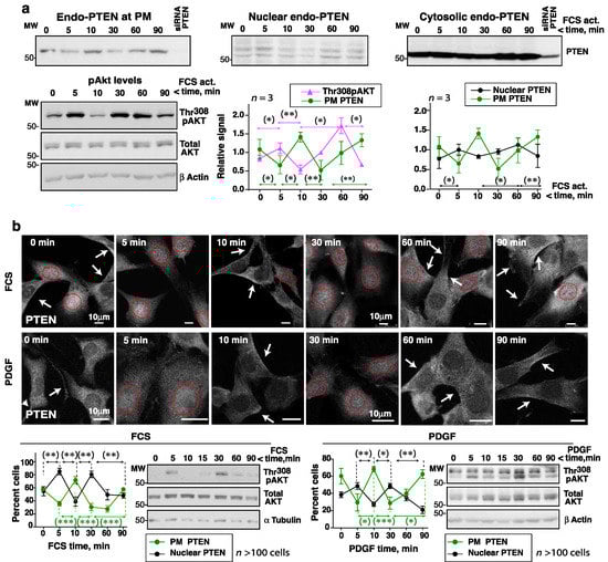 Cell activation with FCS or PDGF alters PTEN localization at the times of pAKT peaks and troughs. (a) HEK-293T cells were incubated in serum-free medium (2 h) and then stimulated with FCS (15%). The pAKT content in WCE was tested in a fraction of the cells (indicated). The remaining cells were subjected to fractionation to isolate the cytosol, PM, and nuclear fractions. Blots show the PTEN levels in the different fractions. The graphs show the pAKT and PTEN signals corrected for the AKT and the cell fraction marker contents, respectively, and normalized to the mean pAKT or PTEN signal (equivalent to 1) (mean ± SD, n = 3). (b) Representative IF images from an assay (of n = 4 with similar results) showing the PTEN signal in NIH3T3 cells incubated in serum-free medium (2 h) and then stimulated with FCS (15%) or PDGF (50 ng/mL) for different times. A fraction of the cells was lysed and the pAKT levels at different times examined by WB. The graphs show the percentage of cells with a PM PTEN-positive signal (arrows), or a PTEN-nuclear positive signal (surrounded by a dashed red line) (mean ± SD, n > 100). (a,b) * p < 0.05, ** p < 0.01, *** p < 0.001 Student’s t test.