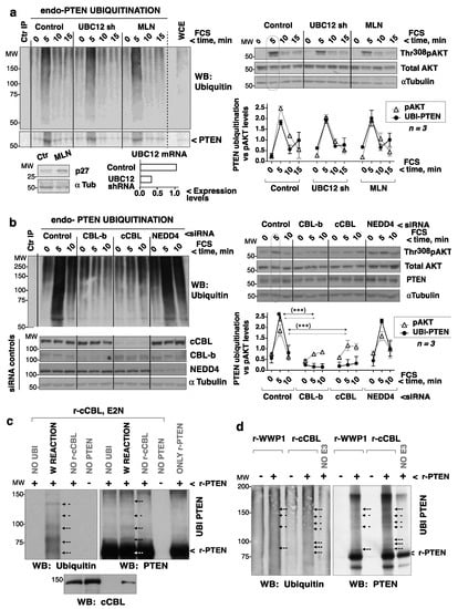 cCBL depletion abrogates GF-induced PTEN ubiquitination. (a) HEK-293T were infected with control- or UBC12 shRNA-encoding lentiviruses (72 h), or treated with MLN-4924 (1 μM, 48 h), then incubated in serum-free medium (2 h) before stimulating with FCS (15%) (indicated). Thr308pAKT levels were examined in WCE. Cell extracts were enriched for ubiquitinated proteins by purification in TUBES columns. The eluted ubiquitin-enriched extracts were used for PTEN IP with Ab-fused Sepharose beads. For controls (Ctr IP), extracts were incubated with isotype-matched control Ab beads; PTEN ubiquitination was examined by WB. Dashed lines indicate lanes that were cut out from the original blots (included as Supplementary Information). UBC12 shRNA efficiency was assessed by q-PCR; MLN-4924 activity via the examination of p27kip levels upon cell incubation without FCS (16 h). pAKT signals were measured, corrected for the AKT level, and normalized to the mean pAKT signal in controls (equivalent to 1). The endo-PTEN ubiquitination signal (60–120 KDa) was measured, corrected for cellular PTEN levels (in WCE), and compared to the mean PTEN ubiquitination signal (considered 1). The graph shows the pAKT signal vs. the ubiquitinated PTEN signals (mean ± SD, n = 3). (b) HEK-293T cells were transfected with control, NEDD4-1, cCBL, or CBL-b specific siRNA pools (72 h). Cell processing, blots, and graphs are as in (a). (b) *** p < 0.001 Chi squared test; the PTEN and pAKT significance levels were similar. (c) Duplicate reactions containing purified r-cCBL (200 ng) and GST-PTEN (200 ng) were incubated with ubiquitin, E1 ligase (250 ng), and UBE2N ligase (250 ng) in ubiquitination buffer (whole reaction; W REACTION). Some of the reactions were performed in the absence of ubiquitin, PTEN, or cCBL (indicated). (d) Duplicate reactions containing non-phosphorylated r-cCBL or r-WWP1 (200 ng) were incubated in the presence or absence of r-PTEN (100 ng), as well as ubiquitin, E1 (50 ng), UBE2H5B (300 ng), and energy regeneration solution. (c,d) Duplicate reactions were examined in parallel WB.