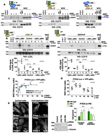EGFR associates with cCBL in a PI3-kinase-dependent manner. (a,b) HEK-293T cells were transfected with PTEN-Luc alone (48 h) (a), or with a mixture of PTEN-Luc, HA-p85α, and HA-p85β cDNA (48 h) (indicated as ↑ p85α, p85β), or were first transfected with a mix of PIK3R1 (p85α) plus PIK3R2 (p85β) siRNA (72 h) and then with PTEN-Luc (last 48 h) (↓ p85α, p85β) (b). The efficiency of these transfections was tested by WB (Supplemental Figure S7b). Cells were then incubated in serum-free medium (2 h) and stimulated with EGF (100 ng/mL). NP-40 or Brij96 extracts (1 mg) were used for EGFR and cCBL IP, respectively. For controls, Prot A or G were incubated with Ab (IP Ctr 1) or lysate (IP Ctr 2). The presence of associated proteins in EGFR or cCBL immunoprecipitates were examined by WB. The last lanes show control WCE (indicated). The graphs (b) show the EGFR signal in cCBL IP, corrected for the cCBL content and normalized to the maximum EGFR signal in complex with cCBL (control at 1 min, 100%) (mean ± SD, n = 3). The graph for the cCBL signal in EGFR IP was similarly plotted (n = 3). (a,b) Dashed lines indicate the cutting out of lanes from the original blots (included as Supplementary Information). * p < 0.05, ** p < 0.01, *** p < 0.001, Student’s unpaired t test. (c) BRET saturation curves in HEK-293T cells transfected with a constant amount of PTEN-Luc and increasing amounts of YFP-p85α. Data were fitted to a non-linear regression equation assuming one binding site (n = 3). FRETmax/BRETmax and FRET50/BRET50 values (mean ± SD) were calculated using a non-linear regression equation (n = 3). (d) BRET efficiency in HEK-293T cells transfected with a fixed 1:1 amount of PTEN-Luc and YFP-p85α (48 h) and stimulated with EGF (100 ng/mL) for the indicated times (mean ± SD, n = 4) (*) one-way ANOVA. (e) Exponentially growing control and cCbl-depleted NIH3T3 cells (72 h) were transferred to glass coverslips (24 h) prior to the IF detection of PTEN (two representative images, each). Blots confirmed cCbl depletion efficiency. The graph illustrates the percentage of cells (mean ± SD, n = 100 cells) with an intense, positive, or negative PTEN PM signal (indicated). * p < 0.05, ** p < 0.01 Student’s unpaired t test.
