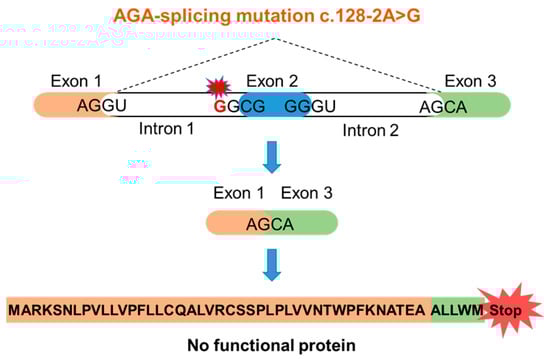 A seven-year-old female of Indian origin with a developmental delay was presented at Murdoch Children’s Research Institute (Melbourne, Victoria, Australia) [6]. Metabolic analysis of the urine showed a substantial increase of glycoasparagines (mainly aspartylglucosamine), suggesting AGU as the underlying disease. Sequence analysis of the AGA gene revealed a homozygous point mutation at the 3′-splice-acceptor site of the intron 1 (c.128-2A>G, sequencing data in Supplementary Figure S1). The consensus splice motif AG at the end of the intron 1 is exchanged into GG. Therefore, it can be predicted that exon 2 is spliced out together with introns 1 and 2, resulting in a frame-shift and an early translation termination (Figure 1). This variant can be classified as a potentially harmful one, but it has not been reported in an AGU patient before. The parents of the patient are not aware of being related with each other, suggesting a non-consanguineous origin of the mutated alleles.