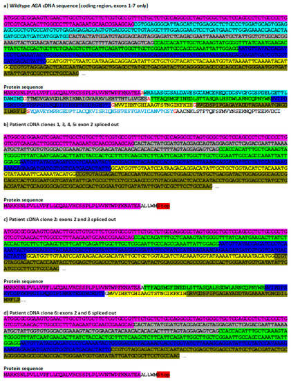 Since the above data are suggestive of a splicing defect, we characterized the AGA splicing variants in the patient cells. The AGA open reading frame was PCR-amplified from a cDNA as described in [4], cloned into a plasmid vector, and six cDNA clones were sequenced (Figure 3). The WT sequence and the resulting protein translation are shown in Figure 3a. The most abundant (four out of six clones analyzed) AGA splicing isoform in the patient cells exhibits an exclusion of the exon 2 (Figure 3b), as expected due to the mutation in the acceptor splice-site preceding exon 2. In addition, single clones that contained either a deletion of exons 2 and 3 (Figure 3c) or exons 2 and 6 (Figure 3d) were also detected. Clones with out-of-frame deletions of exon 2 or exons 2+6 result in an early STOP codon and a predicted highly truncated protein. However, a deletion of exons 2 and 3 results in normalization of the reading frame from exon 4 onwards, and the predicted protein would exhibit a deletion of 89 amino acids in the N-terminal half of the α subunit, but otherwise a normal amino acid sequence.