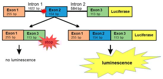 Numerous natural substances exhibit potential as splicing enhancers due to their capability to enhance mRNA stability or to affect splicing directly (for review, see [24]). For testing such substances, we developed a minigene assay that is based on a DNA construct containing AGA exons 1, 2 and 3, together with the introns 1 and 2, followed by the firefly luciferase coding sequence (Figure 4). This construct contains the splice acceptor site mutation -2A>G in intron 1. If exon 2 is spliced out, altered reading frame in exon 3 produces an early STOP codon and prevents the expression of luciferase. However, if all three exons are correctly spliced, the luciferase ORF is translated in-frame as a fusion protein with the AGA protein sequence coded by exons 1–3. Thus, the effect of a treatment of cells with substances that enhance splicing can be measured using luciferase activity, measured as emission of visible light.